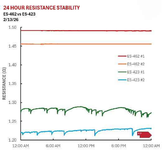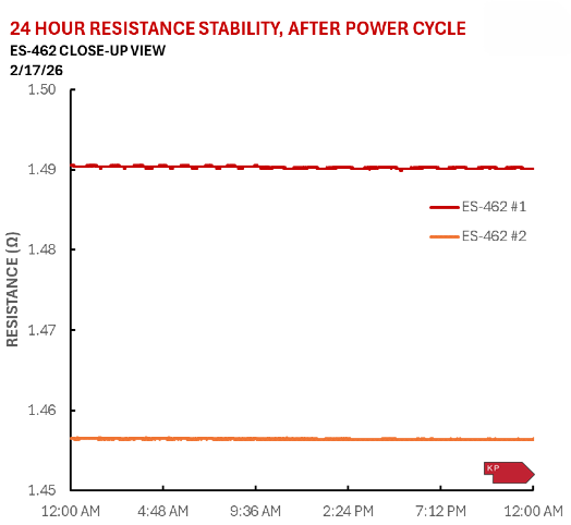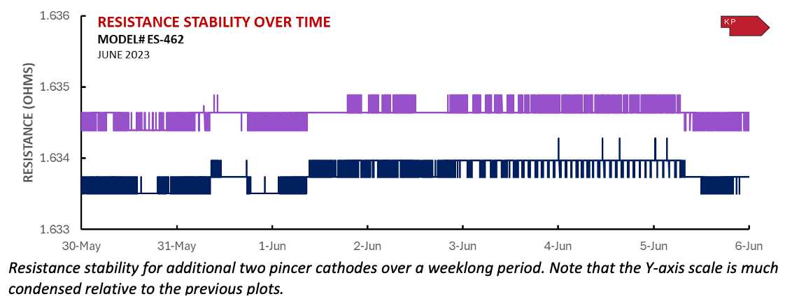 The “Pincer Mount” mechanism, found in the ES-462 LaB6 cathodes, uses two molybdenum pins to directly and firmly clamp the carbon heater. Pincer mount cathodes consistently display minimal resistance fluctuations, even at high operating temperatures of 1800o K or greater. They retain extreme stability after over 10,000 temperature cycles from room temperature to 1800oK and back, and after more than 100 days of continuous operation. Stable resistance equates to stable operating temperatures, which in turn improves the stability of the cathode’s emission.