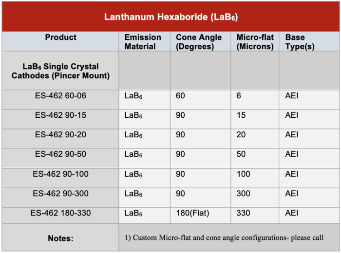 Our patented ES-462 cathodes incorporate improved heat-sinking and robust electrical connections to produce a LaB6 emitter with unrivaled electrical and positional stability.